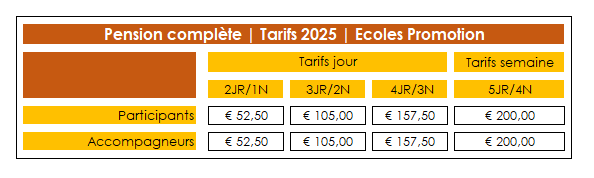 Pension complète: petit-déjeuner, déjeuner, collation souper et nuitée.