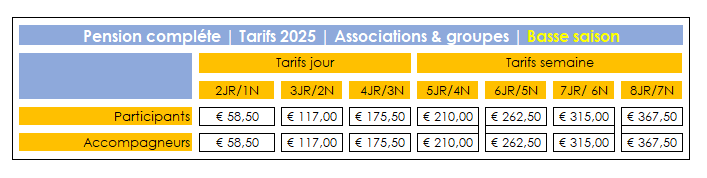 - repas du soir le jour de l'arrivée au déjeuner le jour du départ inclus