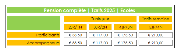 •     repas du soir le jour de l'arrivée au déjeuner le jour du départ inclus